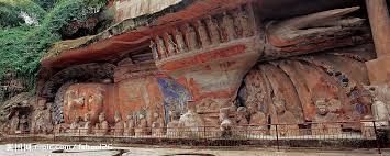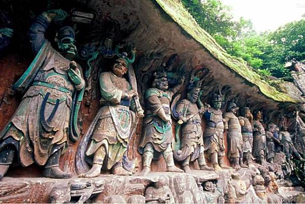 重慶大足石刻群,開於唐朝,盛於宋代,以寶頂山摩崖石刻、北山摩崖石刻最著名。以佛教造像為主,儒、道教並陳,是中國晚期石窟造像藝術典範,可與敦煌莫高窟、雲岡石窟、龍門石窟齊名。一九九九年列入世界文化遺產,進入「世界遺產名錄」的神聖殿堂。