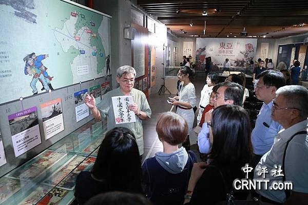 新竹清華大學中文系楊儒賓教授(左一)在“東亞百年巨變:甲午戰爭、乙未抗日紀念文物特展”為觀眾逐一導覽解說,吸引觀眾駐足欲罷不能。(照片:新竹清華大學提供)