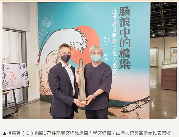 楊儒賓精選了此次捐贈文物中的32件書法、繪畫、手札、長卷等,以「駭浪中的橋梁–近世旅日華裔文化人書畫展」為名,在清華大學旺宏館一樓文物館展覽廳展出。楊儒賓表示,中日兩國近代戰爭衝突頻仍,但民間的文化交流卻不曾中斷,許多僧人、學者、匠人在驚濤駭浪中為佛法、工藝、建築、飲食、醫藥、書畫、音樂交流搭起了橋梁。此次展覽是以文化地緣政治的視角呈現,而非權力地緣政治。