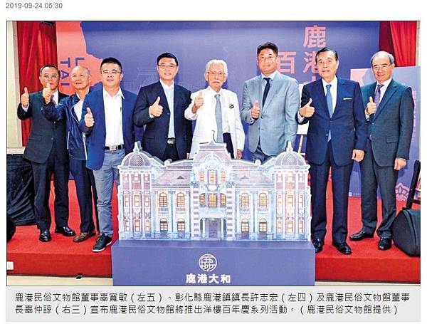 鹿港民俗文物館董事辜寬敏(左五)、彰化縣鹿港鎮鎮長許志宏(左四)及鹿港民俗文物館董事長辜仲諒(右三)宣布鹿港民俗文物館將推出洋樓百年慶系列活動。(鹿港民俗文物館提供)