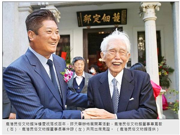 鹿港民俗文物館洋樓慶祝落成百年,昨天舉辦特展開幕活動,鹿港民俗文物館董事辜寬敏(右)、鹿港民俗文物館董事長辜仲諒(左)共同出席見證。 (鹿港民俗文物館提供)