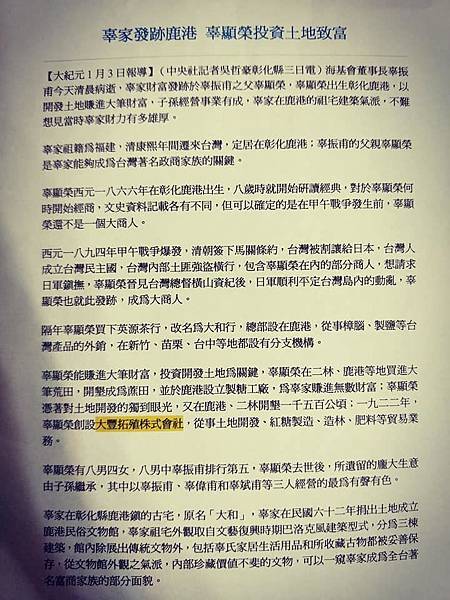 【大紀元1月3日報導】(中央社記者吳哲豪彰化縣三日電)海基會董事長辜振甫今天清晨病逝,辜家財富發跡於辜振甫之父辜顯榮,辜顯榮出生彰化鹿港,以開發土地賺進大筆財富,子孫經營事業有成,辜家在鹿港的祖宅建築氣派,不難想見當時辜家財力有多雄厚。