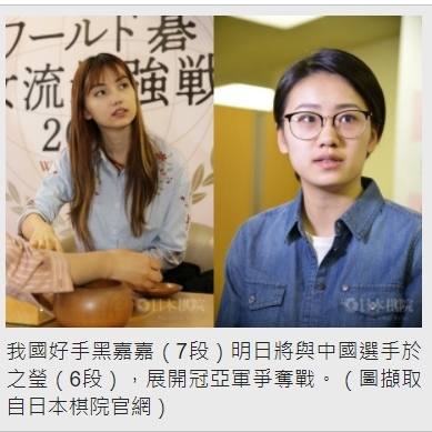 我國好手黑嘉嘉(7段)明日將與中國選手於之瑩(6段),展開冠亞軍爭奪戰。(圖擷取自日本棋院官網)