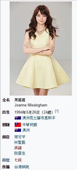 台、澳混血的黑嘉嘉6歲接觸圍棋,16歲代表台灣征戰亞運,一舉奪下女子團體銅牌,如今22歲的她已是七段女棋士,去年還一度拿下台灣女子圍棋最強戰第一名。因為如同明星般的亮麗外貌,曾讓外界忽略她的棋技,她透露「成績沒那麼好時,也有人說我是花瓶」。