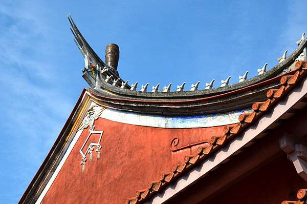 臺南孔廟大成殿正脊兩端通天筒與山牆如意壁鎖