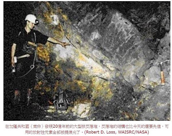在加蓬共和國(南非)發現20億年前的大型核反應堆,反應堆的結構也比今天的還要先進,可用的放射性元素全部被提煉光了。(Robert D. Loss, WAISRC/NASA)