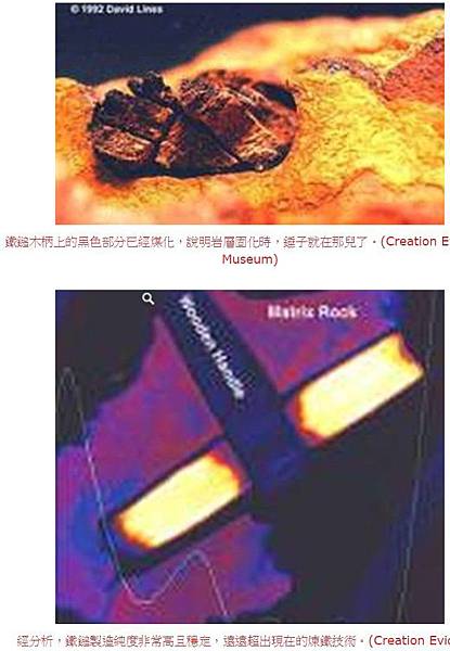 鐵鎚木柄上的黑色部分已經煤化,說明岩層固化時,錘子就在那兒了。(Creation Evidence Museum)