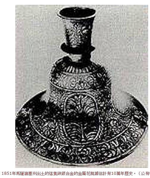 1851年馬薩諸塞州出土的這隻鋅銀合金的金屬花瓶據估計有10萬年歷史。(公有領域)