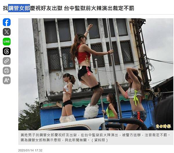 找鋼管女郎慶祝好友出獄 台中監獄前火辣演出裁定不罰 - 社會 - 自由時報電子報 https://bit.ly/4hffrQ0