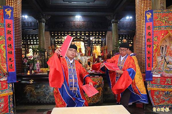 今天是農曆初九,在頭份市昊天宮舉行祭拜天公祈福儀式,縣長徐耀昌(中)、立委徐志榮(左)及頭份市長徐定禎等人祈求苗栗風調雨順、平安順利。(黎薇攝)