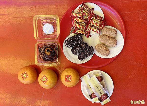 初九拜天公,可準備素的點心、糖果、水果,數量隨心意,心誠最重要,有包裝的糖果,撕開5顆的包裝紙,讓天公聞得到味道。(記者陳鳳麗攝)