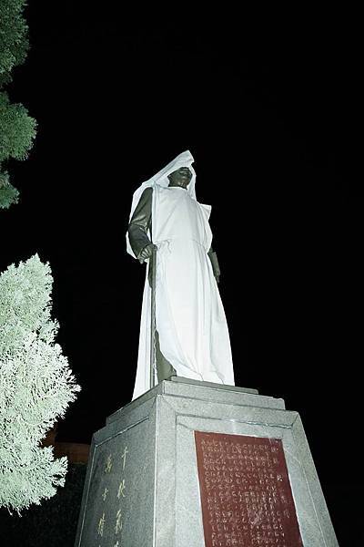 台中市霧峰區公所前的蔣介石銅像,今天凌晨遭人塗抹紅漆抗議。(記者陳建志攝)