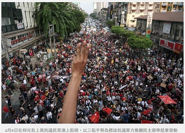 2月6日在仰光有上萬抗議民眾湧上街頭,以三指手勢為標誌抗議軍方推翻民主選舉結果發動政變。(攝影/AFP/STR)