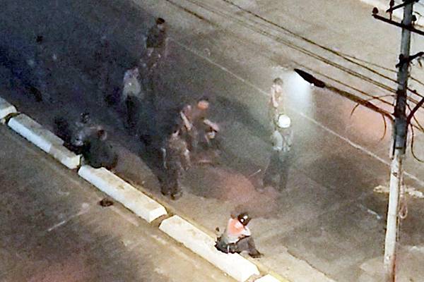 圖為夜間宵禁時間,警察在仰光街頭凌虐一名跪地的平民。 圖/路透社