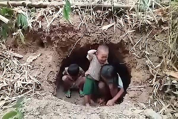 圖為逃亡的兒童躲藏在緬泰邊境區的洞穴裡。 圖/法新社/ANONYMOUS SOURCE via AFPTV