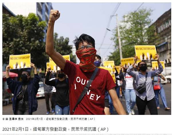2021年2月1日,緬甸軍方發動政變,民眾示威抗議(AP)© 由 風傳媒 提供 2021年2月1日,緬甸軍方發動政變,民眾示威抗議(AP)