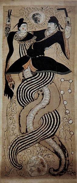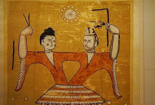 不過,真正有趣的說明,則有如以下轉述:這幅畫像為「人身蛇尾的伏羲、女媧交尾圖,兩人相背,伏羲手執矩,女媧手執規。」這個傳說版本到了中國唐代,依然沒有些許變化,可以參考新疆阿斯塔那唐墓出土的彩帛。