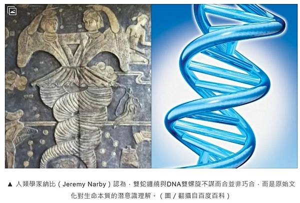 人類學家納比(Jeremy Narby)認為,雙蛇纏繞與DNA雙螺旋不謀而合並非巧合,而是原始文化對生命本質的潛意識理解。(圖/翻攝自百度百科)