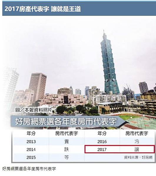 房市進入盤整期,永慶房產集團旗下好房網調查2017年房產代表字結果出爐,網友認為「讓」字在今年房市中最為關鍵。「讓」字反映了今年房市現象,是買賣雙方都不得不認同的唯一指標,不論是新屋推案還是中古出售,有讓利才有成交,讓利屋就是今年市場的王道。