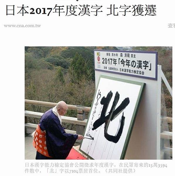 朝日新聞報導,日本漢字能力檢定協會公開徵求年度漢字,在民眾寄來的15萬3594件數中,「北」字以7104票居首位。