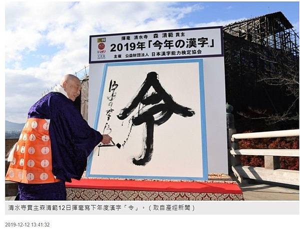 〔駐日特派員林翠儀/東京12日報導〕日本京都清水寺的貫主森清範,今天下午在清水寺揮毫寫下代表今年世態的漢字「令」字。