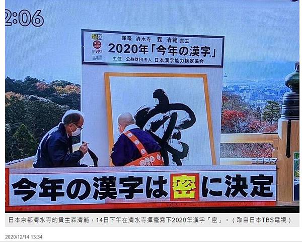 日本京都清水寺的貫主森清範,14日下午在清水寺揮毫寫下2020年漢字「密」。(取自日本TBS電視)
