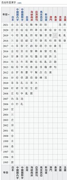 | 2016 | 苦 | 楊丞琳 | 10,328 | 年初美濃地震引發維冠金龍大樓倒塌事故;多個颱風侵襲台灣;整體經濟狀況未好轉且兩岸關係急凍;勞基法一例一休及廢除七天國定假日之爭;歐美瀰漫保護主義及民粹主義、英國脫歐、唐納·川普當選。 |