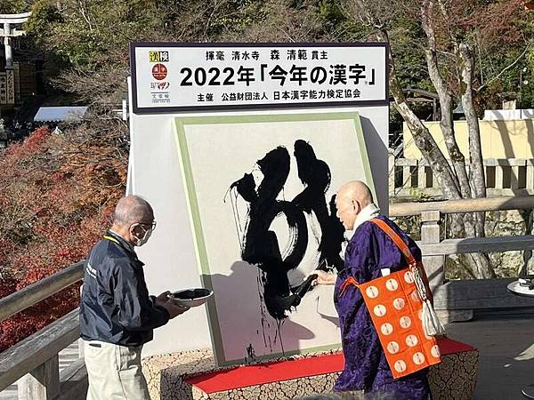 年度漢字每年均在清水寺的國寶「清水舞台」,由貫主森清範揮毫發表,但因清水寺進行大整修預定到明年3月才完工,發表的舞台也從前年起移至後院,森清範今天下午在高1.5公尺、寬1.3公尺的和紙上寫下「令」字。