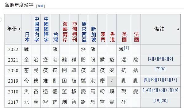 過去10年的代表性漢字,從2010年起依序是:命、偽、變、新、暑、絆、金、輪、稅、安。