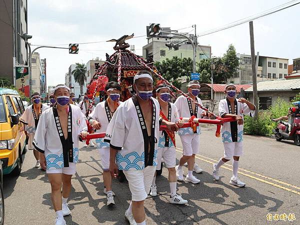 豐原城隍廟是全國唯一具有日式神轎的城隍,抬轎民眾也穿著日式服裝,十分吸睛。 (記者歐素美攝)