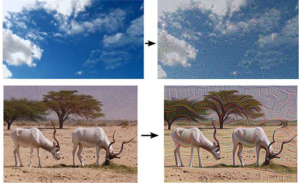 研究小組透露,經過一系列的辨識和優化算法,DeepDream 能夠將圖片中的內容按照辨識的結果,也就是人工智慧的認知重新創作,人工智慧型的作品基本上能夠在準確地畫出原作的輪廓,在著色上略顯生澀,獨具風格。