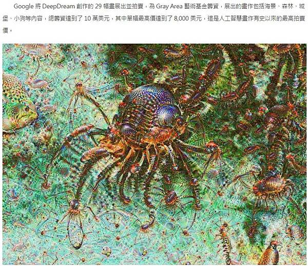 Google 開源程式 DeepDream 是辨識和整理圖像的人工智慧算法,DeepDream 除了能夠辨識圖像外,研究小組加入了創作的算法,人工智慧程式能夠在辨識圖像後加入新的元素,創作出新的畫作,近日在一個拍賣會後,29 幅機器感十足的畫作共籌資 10 萬美元。
