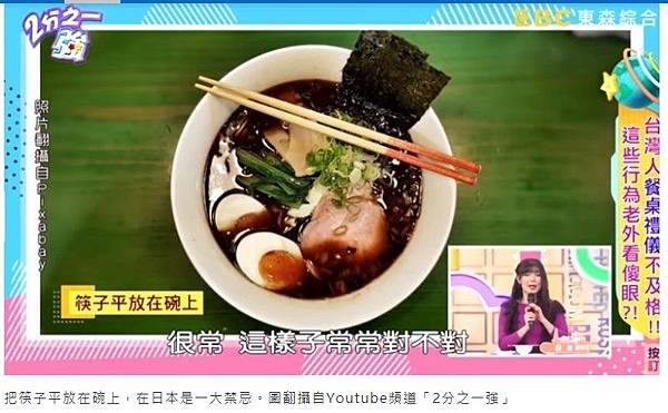 各國風俗民情不同,尤其用餐時,大家的習慣不盡相同,一旦不了解當地的用餐禮儀,可能鬧出笑話!日籍女星梨梨亞近日在節目上表示,台灣人習慣把筷子平放在碗上,但此舉在日本絕對不能做。