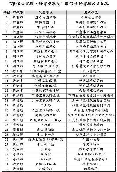 新竹縣內的47處環保行動書櫃設置地點如下表,若針對環保行動書櫃有任何疑問或民眾願意提供更多二手書籍充實本書櫃,可電洽新竹縣環保局專線電話:03-5551872,楊先生或甘小姐洽詢。