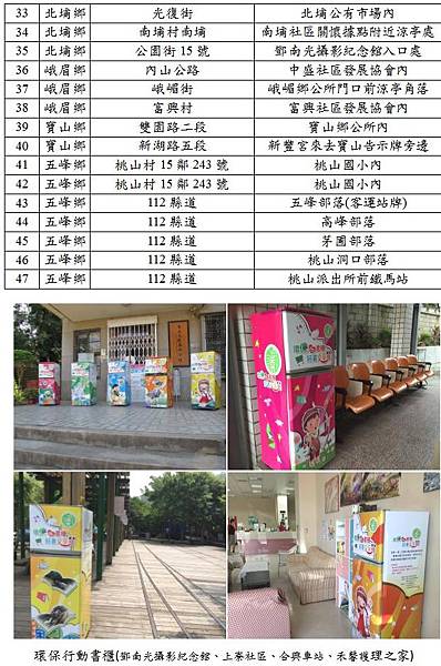 47處環保行動書櫃包括桃山派出所前鐵馬站、桃山國小、北埔鄧南光攝影紀念館入口處、內灣線合興、竹東、內灣3個車站、新埔農民市場內咖啡廳、湖口仁慈及竹北新仁、大安醫院內、尖石鄉環樂齡學習中心等,全縣共有,囊括觀光地區、政府機關、車站場所、社區發展協會、醫院及公園等公開場所,讓洽公、觀光或是社區居民、學生可隨手取閱,開心閱讀。詳情可電洽新竹縣環保局專線電話:03-5551872,楊先生。