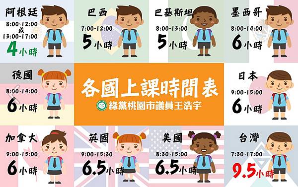 桃園市議員王浩宇製作了一張各國學生上課時間表,台灣以九.五小時居冠。然而美國和英國六.五小時,日本和德國六小時,阿根廷甚至只有四小時。