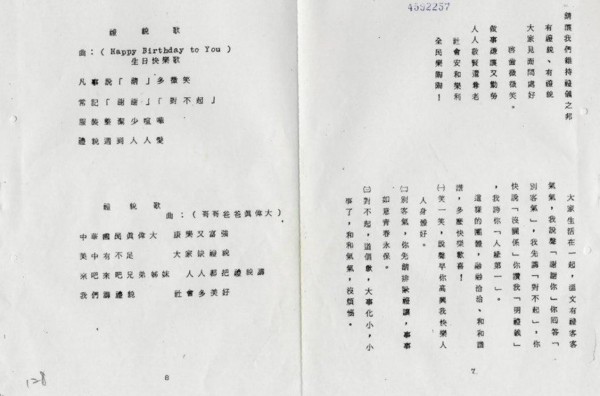 黨產會查出,婦聯會行政院分會曾黨國不分推行禮貌運動,將「哥哥爸爸真偉大」一曲改編成「禮貌歌」,並由台灣省政府印發小冊,分送各單位運用。圖為台灣省政府文件,收錄婦聯會的禮貌歌。(記者陳鈺馥翻攝)