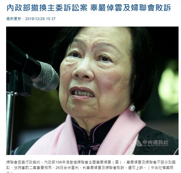 (中央社記者劉世怡、余祥台北26日電)婦聯會拒簽行政契約,內政部106年底撤換婦聯會主委辜嚴倬雲。辜嚴倬雲及婦聯會不服分別興訟,法院審酌二案事實相同,今天合併宣判,判辜嚴倬雲及婦聯會敗訴,還可上訴。