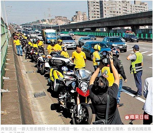 國道七隊警察昨上午在國道三號南投段攔獲一名大型重機騎士,他聲稱要北上支援活動;國道五隊則在國道一號南下鼎金路段發現3名違規騎士,但未截獲;CRC美式重機協會台南分會也號召50輛重機,象徵性地騎過國三關廟交流道下方。