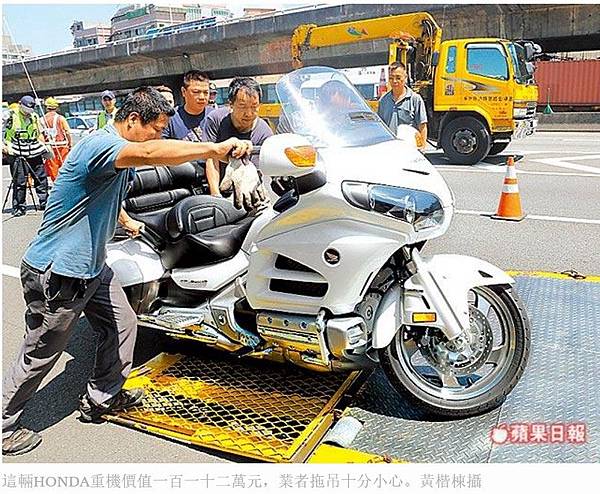 這輛HONDA重機價值一百一十二萬元,業者拖吊十分小心。黃楷棟攝