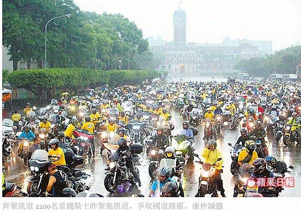 昨下午2時許,約2200輛大型重機集結凱道陳情,要求立即試辦紅牌重機上國道,全面開放國道路權,平均每輛重機價值約60萬元,總價值超過13億2000萬元,號稱史上最貴抗議團。