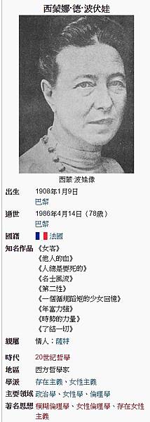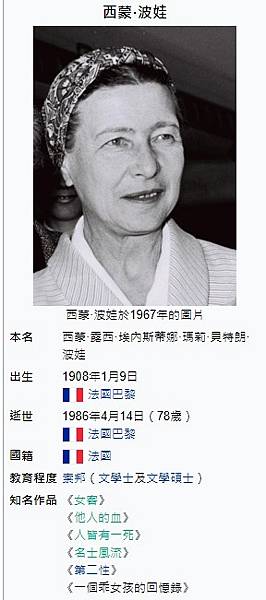 西蒙.德.波娃(Simone de Beauvoir),一九四三年發表第一本小說「客人」。一九五四年發表的「第二性」,給予法國婦女運動決定性和持久性的動力,但也引起爭議和攻擊。她的作品思想不離開存在主義,影響法國文壇,也提供了人文科學領域豐富的想像空間。
