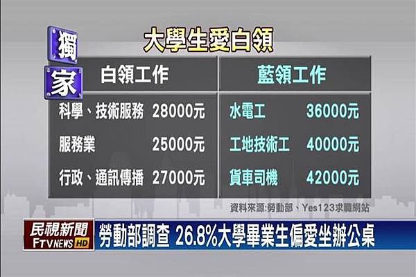 勞動部調查就發現,26.8%的大學畢業生,偏愛坐辦公室。看看大學生最愛的前三工作,服務業、行政類,起薪只有25000元~28000元,平均起薪27000元。但藍領工作,水電工、工地工人40000元起跳、貨車司機42000元,月薪多了快一倍,仍舊乏人問津。
