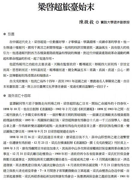 梁啟超是清末民初時期知名的文人及政治家,一八九五年清廷戰敗而簽訂「馬關條約」,將台灣割讓給日本,康有為、梁啟超聯名上書給光緒皇帝,要求維新變法,二人受到皇帝重用,史稱「戊戌變法」。但是,變法運動受到慈禧太后等守舊派人士反對而失敗,梁啟超只好流亡日本。