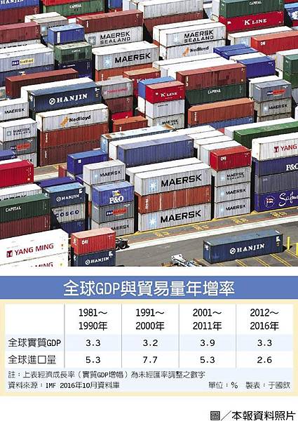 據統計,2012~2016年全球貿易量年增率2.6%,非僅是歷年新低,更低於同期間全球經濟成長3.3%,這5年的貿易量增幅,年年都低於經濟成長,這說明此一變化並非偶然的現象,而是已形成新趨勢。