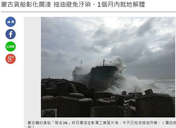 分享蒙古貨船彰化擱淺 抽油避免汙染、1個月內就地解體到Facebook 分享蒙古貨船彰化擱淺 抽油避免汙染、1個月內就地解體到Line 分享蒙古貨船彰化擱淺 抽油避免汙染、1個月內就地解體到Google+