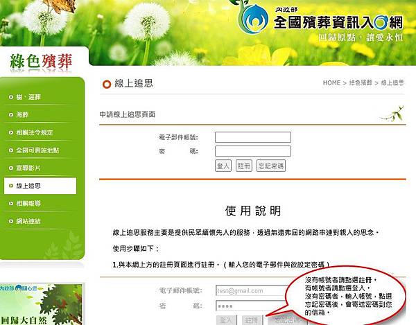 內政部線上追思系統畫面。內政部線上追思系統畫面。 (來源:截自內政部網站)