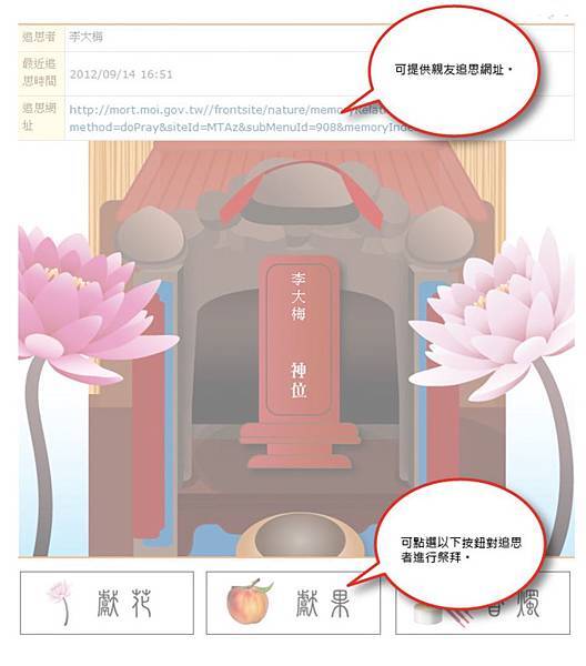 以內政部的追思系統為例,只要註冊登入,就可設定想追思的對象,並出現模擬牌位畫面,同時提供追思者上香、獻花、獻果等選項,甚至,還可以把該網址分享給親友,讓親友一同追思。
