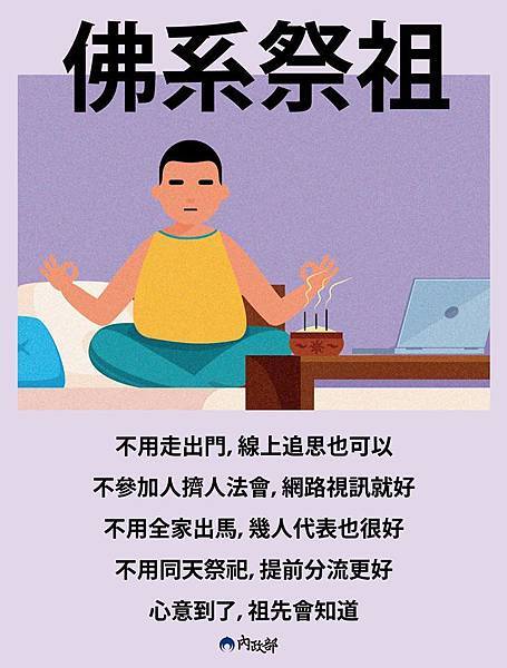 因此,楊登嵙認為,其實祖祠或家裡就有供奉祖先的牌位,就如同祂們就在那裡,在那裡祭拜就可以,比用電腦「線上祭祖」更好,不必到墳墓或靈骨塔掃墓祭祖,避免群聚感染。