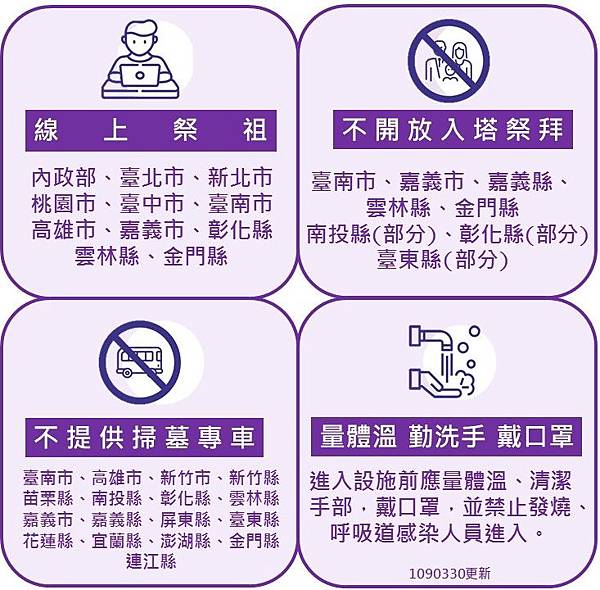 近來新冠肺炎COVID-19(中國武漢肺炎)蔓延全世界,疫情相當嚴重,台灣確診個案數持續增加尚未趨緩,「清明節」是國人慎終追遠,掃墓祭祖的重要節日,國內外各地民眾將陸續返鄉祭祖,幾乎成為全民運動,今年「清明節」是4月4日,於4月2日至5日為連續假期,屆時恐湧現大量人潮掃墓祭祖,憂心人群聚集會造成高傳染風險,國家衛生指揮中心(NHCC)及各縣市政府也開始呼籲,希望民眾能夠以「線上祭祖」和「分流掃墓」,避免群聚感染風險。